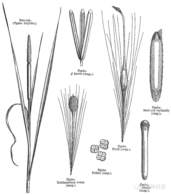 在挺水植物里,东方香蒲实在是很难和芦苇搞混。首先,芦苇有直立茎,东方香蒲没有啊!东方香蒲露出地面的部分全是叶子好吗!带状的叶子在伸展中略有扭转,质地比较厚实,上下粗细变化不大,先端是圆钝的,这些特征可以和菰(茭白)这种同样是叶子挺水的植物区分。叶子的横断面是新月形的,可以看到很多空腔。这样的结构既可以增加叶子强度,又可以向水下部分输送空气。东方香蒲是雌雄同株的,雄花序就长在雌花序上方,但存在时间很短,花粉散完之后就凋谢了。雄花没有花被片,只有3枚雄蕊。雌花序非常致密,一平方厘米里挤了上百朵。雌花的子房有细长的柄,还有大量的细毛和这些柄挤在一起。雌花只有一部分是可育的,但最后产生的种子数量也很可观。种子成熟时,干燥的毛和子房柄膨胀开来,整个果序就会变成非常没节操的样子……