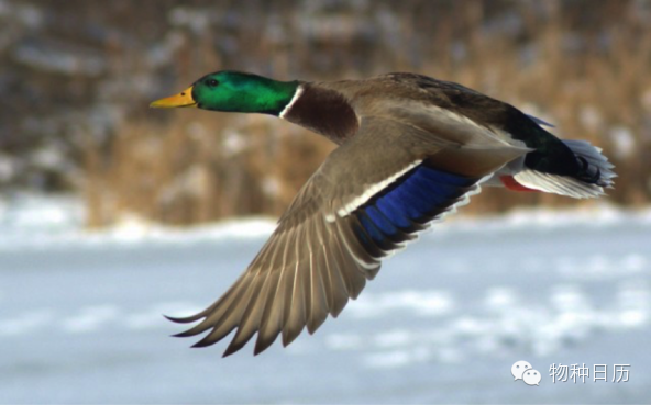鸭科的鸟还有一个很有意思的可以拿来作为种间辨识特征的结构:翼镜。其实它并不是独立特有的结构,而是由次级飞羽和翼上大覆羽形成的具有特定颜色的区域,每一种鸭子的翼镜颜色组成都不一样,在飞行时很显眼(就是下图翅膀上那一块蓝紫色矩形色块,实际上绿头鸭的翼镜是有金属光泽的,因而还会有绿色光泽),游泳和在地面站立时隐约可见(前两张照片里翅膀处露出的一点蓝色就是翼镜了)。雌雄都有翼镜且翼镜的颜色是一样的,所以用翼镜来辅助辨识种类是很靠谱的,尤其是在长相相似的各种雌鸭子之间。