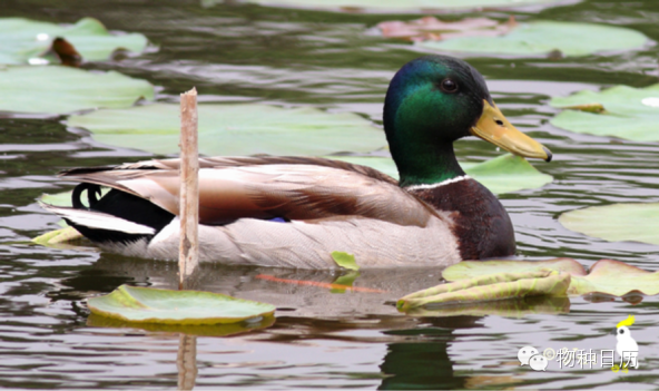 绿头鸭(Anas platyrhynchos)广泛分布于全中国,是最常见的鸭子之一。繁殖羽的绿头鸭雄鸟不会错认:头部墨绿色有金属光泽,因而得名绿头鸭,是这个种最显著的识别特征(它们一般集群或者成对活动所以能够看见公鸟);颈部有一道白环隔开头部的绿色和胸前的紫棕色,喙亮黄色,尾上覆羽还有个“卷”,是特化的羽毛上翘的视觉效果,也是这个种的特色。