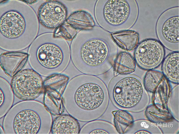 圆柏的花粉,可以分辨花粉的内壁和外壁,还有很多瘪的花粉是败育的。图来自http://www.heliotown.com/
