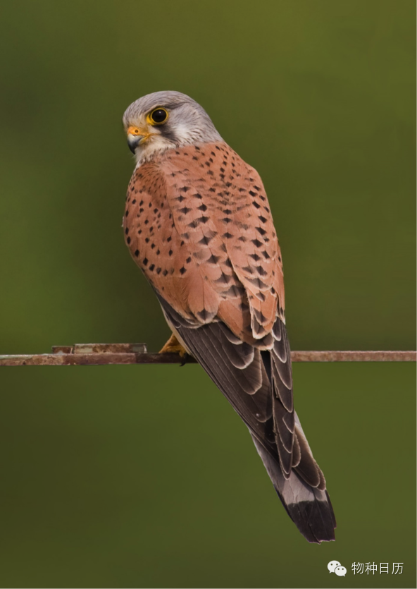 红隼(Falco tinnunculus),隼形目隼科隼属,体长约34cm,在猛禽里属于体型较小的鸟,雌鸟明显比雄鸟大一圈(对于很多猛禽而言,雌鸟都比雄鸟要大)。脸颊上有显眼的黑色条纹,是红隼以及其他一些隼的共有特征;背部和翅膀的砖红色上点缀着黑色斑点是这个种明显的识别特征;飞羽黑色,翼下虽然不红但也有黑色斑点;腹下淡黄色点缀着黑色纵纹;尾羽灰色,有着宽阔的黑色次端斑,在展开时尤为显眼。成年雄鸟头部灰色,而成年雌鸟和幼鸟的头部则为红褐色。