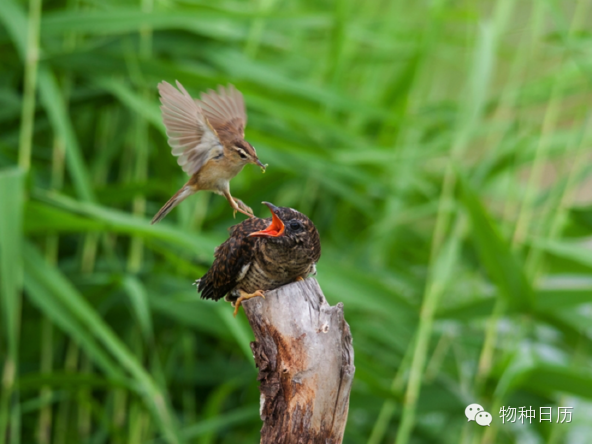 黑眉苇莺 Acrocephalus bistrigiceps 在喂养大杜鹃雏鸟(图片来源:ziranzhi)