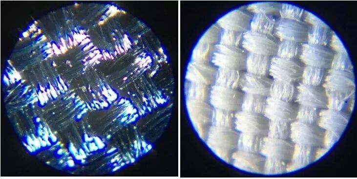 120倍显微镜下,传统雨伞(左)与Rain Smile淋不湿雨伞(右)伞面的纤维。右边的纤维显然更致密。