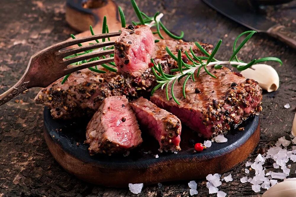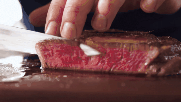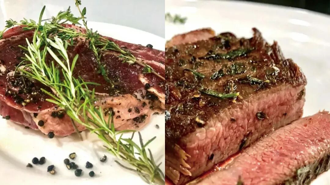 全生的牛排,软韧而富有弹性,肌纤维饱含汁水,能够尝出氨基酸的鲜、淡淡的咸和微微的酸,但香味物质十分匮乏,因此柔嫩的生肉不具备“肉香”。煎烤加热能对牛排的肌纤维造成物理性破坏,使肌肉细胞释放出带有“肉香”的风味物质,随后化学反应取代了物理变化,肉汁和油脂在高温下分解并重组成新的分子,随着牛排不断变干,肉香也不断强化并产生额外的焦香,这就是牛排从“柔嫩多汁”变得“焦香四溢”的过程。