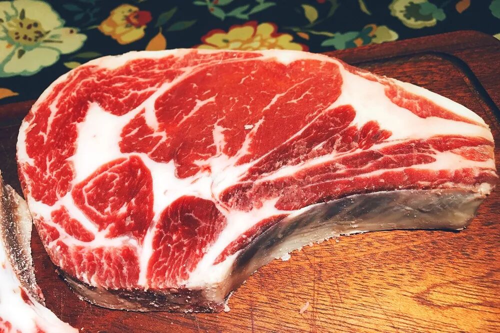 “战斧牛排”(Tomahawk steak)从属的肋眼(rib eye)与菲力(tenderloin)、西冷(Sirloin)同为牛脊处的三大经典部位,虽然肉质不如小菲力细腻,但拥有菲力无可比拟的浓郁牛排风味,最美不过骨边肉,比单纯的西冷牛排更令人着迷。厚切3cm单片足足450克,切去了多余牛骨部分,方便大家烹饪,适合一人过瘾,两人分享。