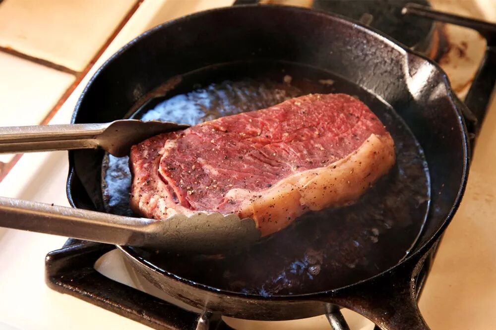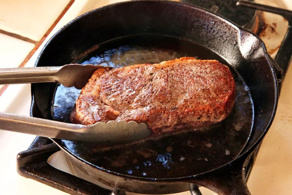 如果平底锅没有充分预热,下锅后溢出的肉汁汽化过缓,会在牛排周围汇聚,那牛排就相当于在“肉汤中闷煮”,煎烤时间会延长,焦香风味也会打折扣。锅要热到怎样的程度才算充分,大致需要达到油的烟点,也就是让锅底的油开始冒烟即可。可以说,充分热锅是煎牛排最最重要的一步。牛排下锅前可以撒上盐粒和黑胡椒调味,这也能帮助表层焦化外壳的形成,待到一面黑胡椒散发焦香时就是调小火力的最佳时机。