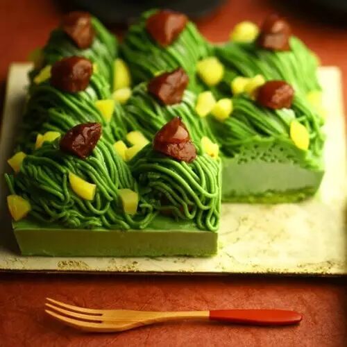 最后是组装,抹茶蛋糕切成合适的大小,表层涂抹牛油果泥,将毛豆泥至于裱花袋中,将其挤出覆盖在表面,最后撒上糖粉就大功告成!