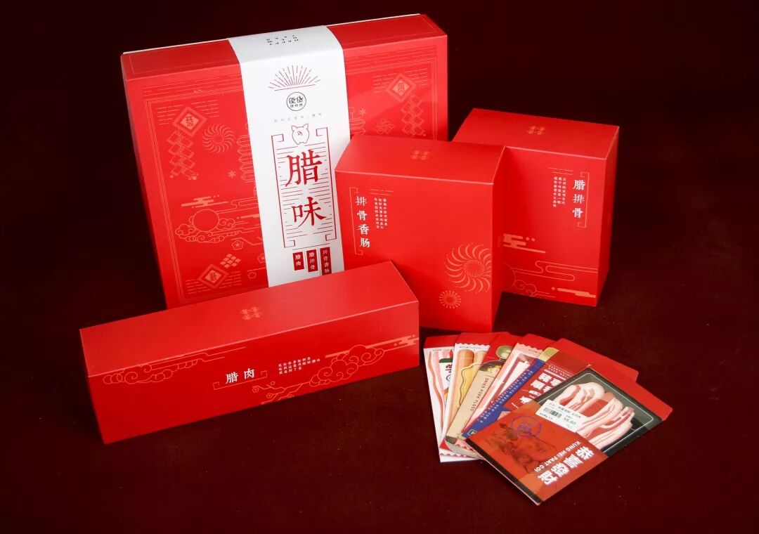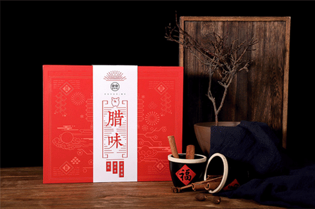 这款“腊味”礼盒的包装是经典的红底暗纹四方盒,图案借鉴了传统年画剪纸的风格,将“年味”元素一一呈现。内里为独立包装,规整又便于保存。
