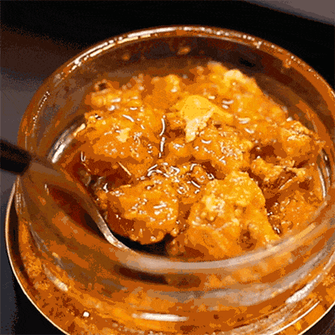 将蒸熟的大闸蟹用机器打碎,和生姜、小葱等一起倒入锅中细火慢熬6个小时,才能让蟹油蟹香扑鼻。熬完油的蟹肉弃之不用,随后倒入蟹膏、蟹黄,方成一份秃黄油。