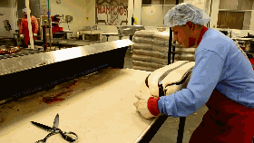 长条状的糖膏经过扭转、切割成为长度一致的糖棒,