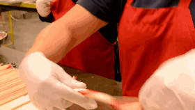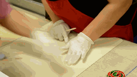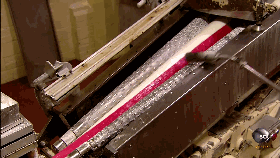 均匀用力,使两种颜色的糖膏贴合。之后就可以送到辊床上进行拉条。