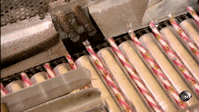 这些糖果继续在传送带上完成冷却过程后,就可以打包出厂,运送到各个糖果店,被沉浸在节日气氛中的人买回去挂在圣诞树上啦!