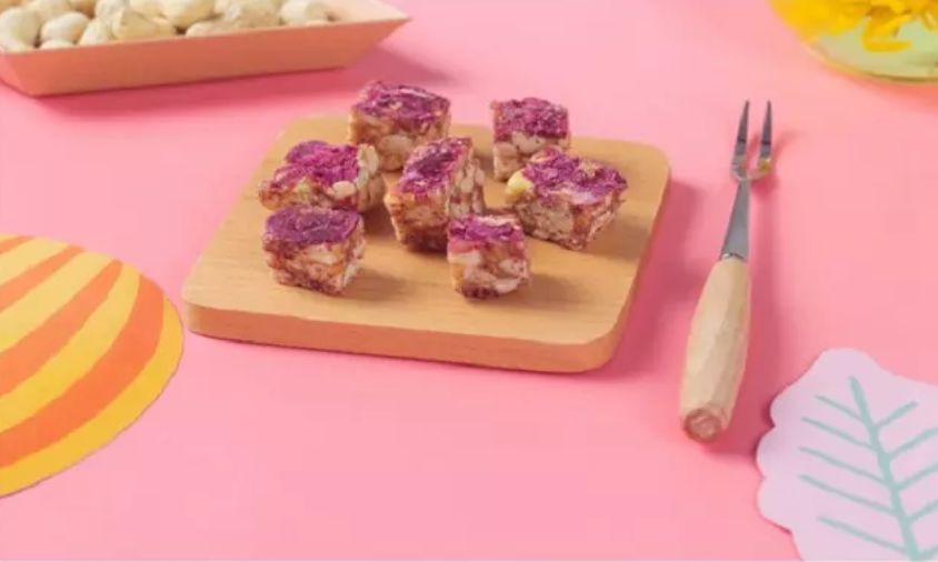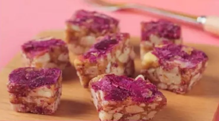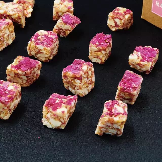 玫瑰花生酥的表面覆盖着新鲜的花瓣,看上去就非常可口。轻轻拿起一块,放在嘴边,吃上一口香脆酥爽,花生满满的香味随着舌尖的跳动绽放,充满了整个口腔。