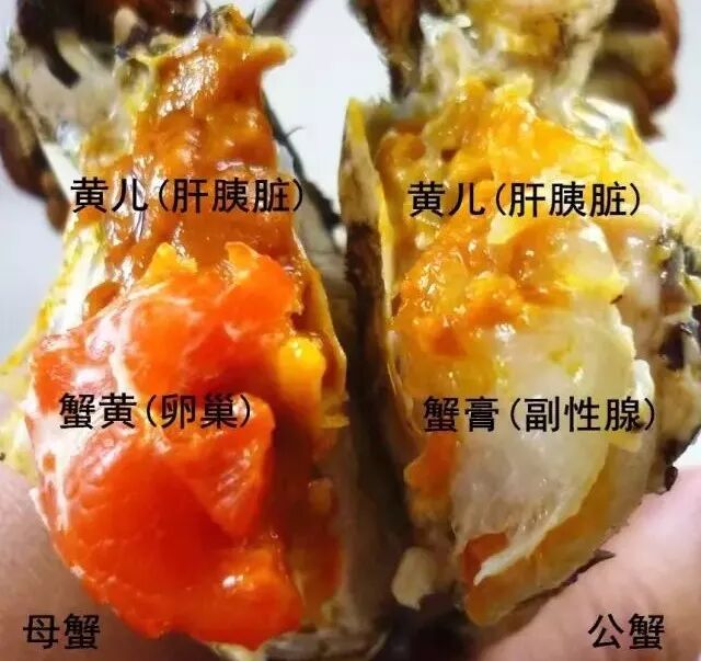 吃大闸蟹,一个是吃蟹肉,但主要吃的还是蟹黄和蟹膏。母蟹的“蟹黄”是橙黄色的肝胰腺和桔色的性腺(卵巢),而公蟹的黄也是肝胰腺,蟹膏则是副性腺(雄性哺乳动物的前列腺是副性腺的一部分)。