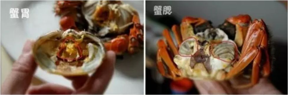 吃蟹的时候,一定注意的是,蟹胃和蟹腮最好不要食用。蟹胃是在贴近蟹壳的一个三角形的器官,饱满的螃蟹一般蟹胃会被蟹黄所包围,一不小心就会被误食,因为螃蟹常吃各种动植物残骸,胃内往往有腐烂的水草或者鱼虾。蟹腮在蟹身体两侧,北京也称之为“麻肉”,蟹腮是蟹的呼吸系统,与水交互接触可能会残留一些水中的杂质。