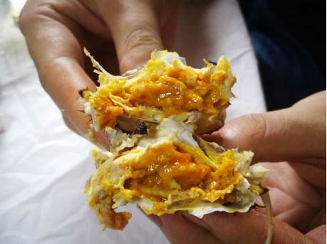 一群人抓到一只蟹也很开心了,载着一只阳澄湖大闸蟹满载而归。这只蟹最后咋样了?当然是下了肚子。鲜甜自是无需多说,一口下去,心中暗喜这一趟没白来,吃完后连手指头都带着淡淡的鲜甜,没有腥味,就是我心目中大闸蟹该有的味道了。只不过那时蟹还不太成熟,蟹黄嫩了点,也不够饱满,从图中就能看出处于流沙状的蟹黄占比更多一些。
