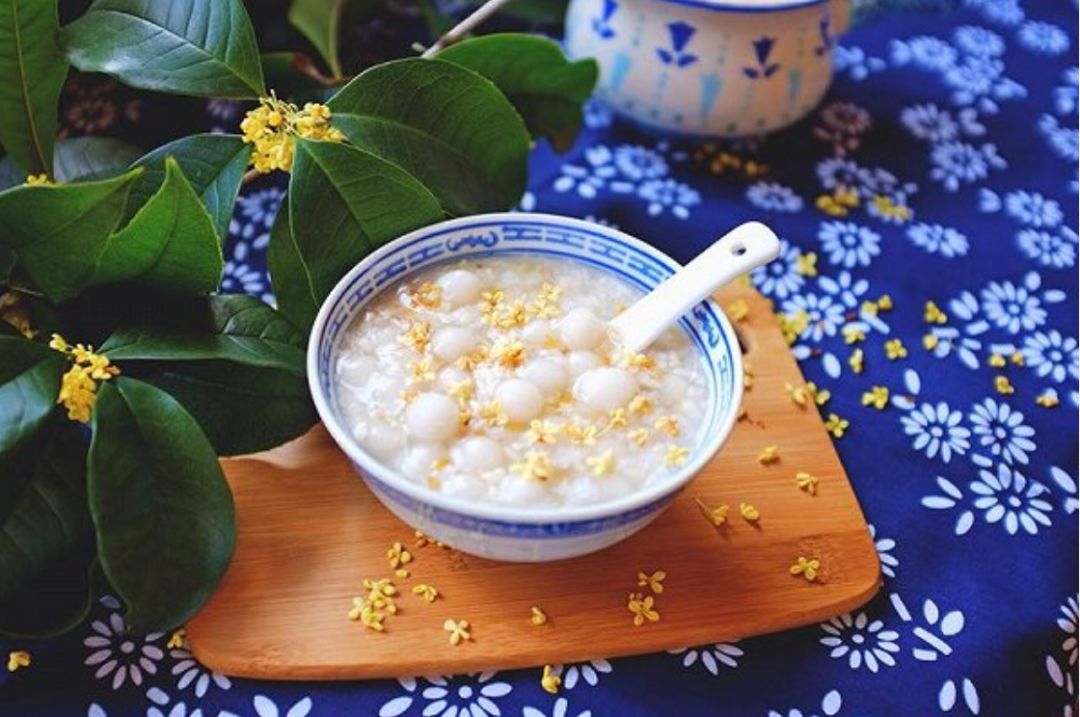 糯米圆子用米酒煮开,撒上香甜的桂花。