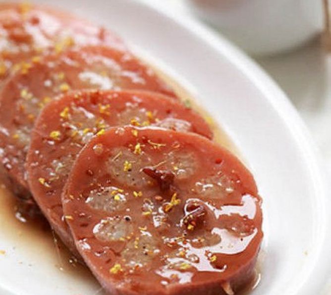 把藕节洗净去皮,在顶端切一个小帽子,往藕孔中塞满泡好的糯米,用牙签封牢盖子,加水、红糖大火煮开,转中火煮一小时,再加冰糖改小火煮一小时,出锅以后切片摆盘,撒上桂花酱就大功告成!桂花的甜香、糯米的软弹、莲藕的黏滑,让这道中式甜点成为不少人的心头好总惦记。