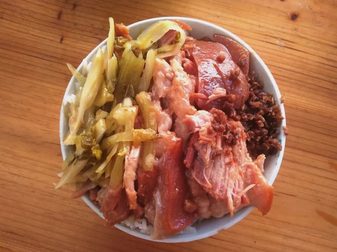 将卤好的猪脚切好盖在米饭上,配上解腻的咸菜和菜脯粒,肥而不腻。