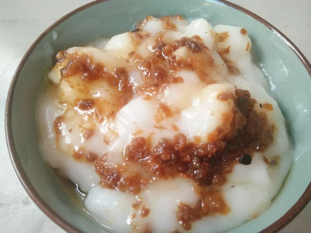 猪捞粿也叫糕粿,将白米浆装入桃形的陶瓷器皿里蒸熟,浇上用油爆炒过的菜脯粒。菜脯粒做得好不好吃是评价一家糕粿的关键。菜脯粒有甜口也有咸口,各具特色。白色的粿挺有嚼劲就是没有什么味道,但浇上菜脯粒后,香得不得了,一口气就能吃上6、7个。