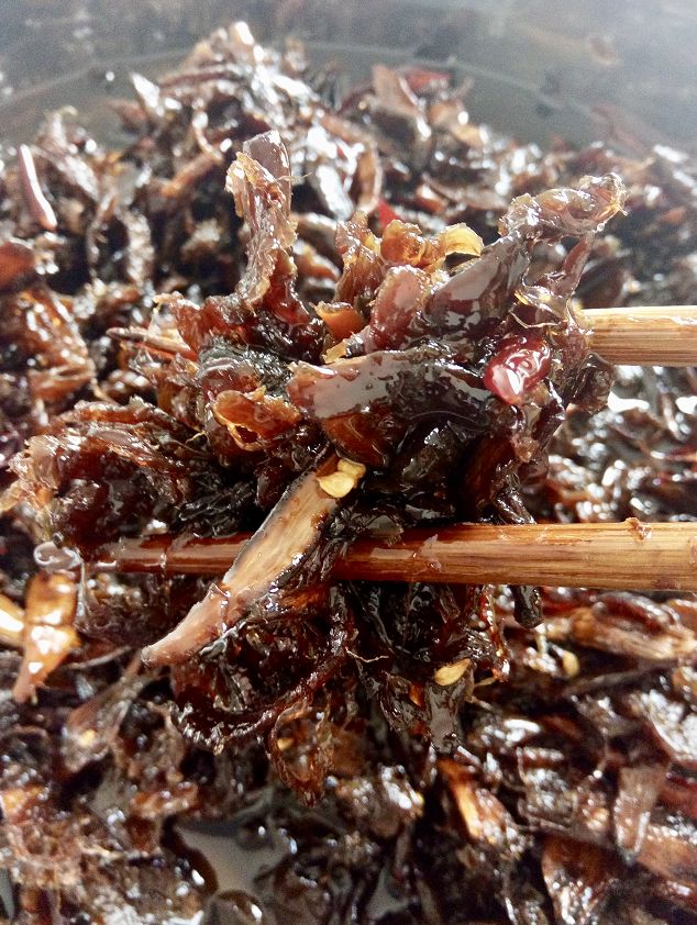 3、如果希望延长保存期和方便邮寄,就用干辣椒替代鲜辣椒,选云南的丘北辣椒提前泡洗又晒干,剪均匀的段;