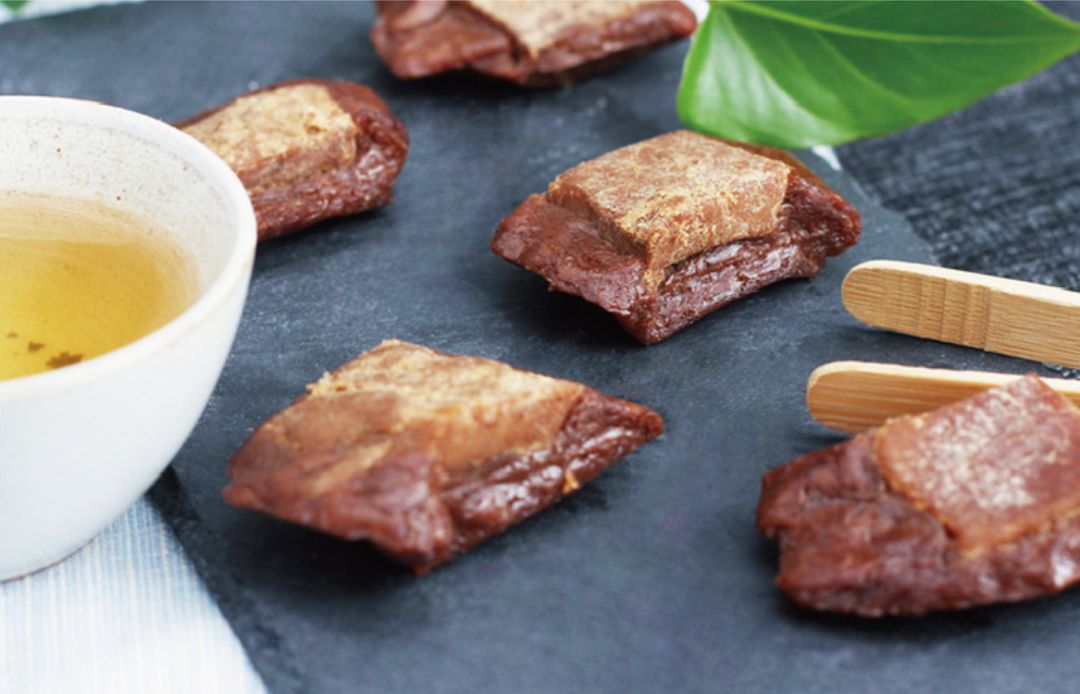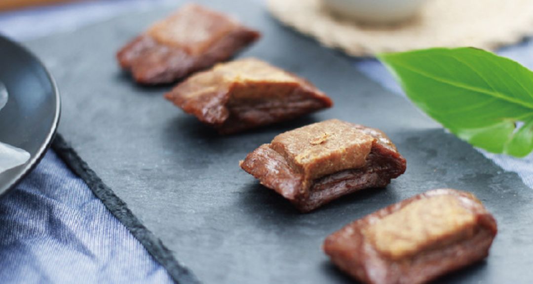 肉干的制作也不能含糊,毕竟这块肉是肉豆干的精妙所在。为了做好这块肉干,精选上好的闽西土猪,取其后腿肉,因为那里筋少肉多,且肥肉少瘦肉厚,吃起来不费劲,小孩子长牙齿也能嚼得动,最适合拿来搭配肉豆干了。选好了肉,切块,然后加入香辛料焖卤,最后和卤制过的豆干夹在一起,一块能勾起无数馋虫、让人口水直流的肉豆干就完成了。