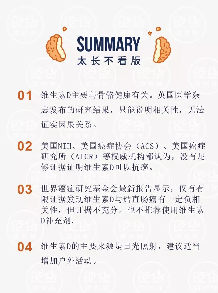 实际上,目前国际上权威机构认为,没有足够证据显示维生素D能抗癌。美国NIH、美国癌症协会(ACS),还是美国癌症研究所(AICR)都认为,目前并没有足够证据证明维生素D可以抗癌。2017年,世界癌症研究基金会更新了最新的饮食营养与癌症报告。在这个报告中对维生素D与癌症也进行了分析,结果认为,目前仅有非常有效的证据显示,维生素D可能对结直肠癌(colorectal cancer)有一定降低风险的作用,但证据非常有限。