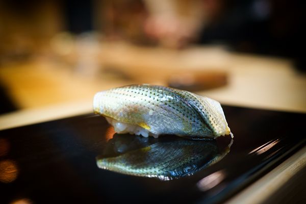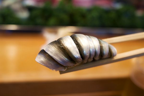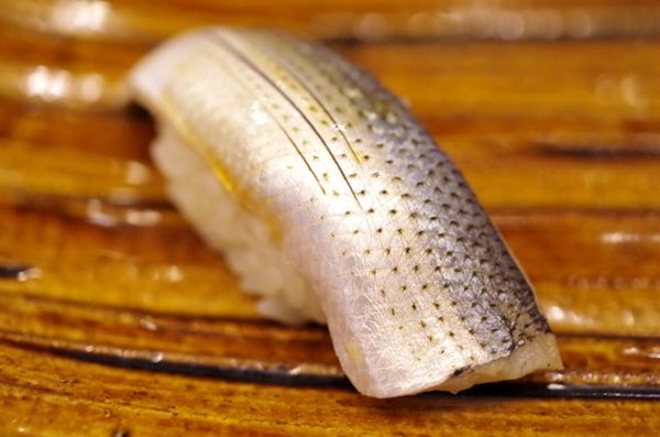 鰶鱼这类鱼皮纤薄光亮的鱼,也被称为“光り物”。常见的譬如“太刀”(带鱼)、鲭(青花)、“鯵”(竹荚)和“鰯”(沙丁)等,用它们握寿司时常会保留鱼皮,它们味道鲜美却又极易腐坏。因此费心得到的新子或小鳍,对于厨师来说更像是烫手山芋,小鳍的价格不菲也源于极高的料理难度。