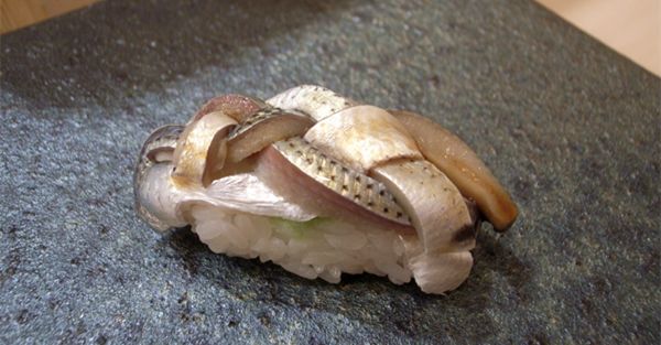 小鳍寿司在外形上的丰富变化,也是品尝的乐趣之一。新子体型太小,一贯寿司会堆上叠若干条,这种手法称为“n枚付け”;大些的新子或小鳍一条就能捏一贯,称为“丸付け”;再大些的一条能剖两片握两贯寿司,被称为“片身付け”,那些大号的鰶鱼,只能切成条状作“网状编”了。
