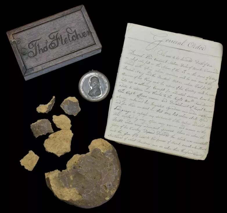 如果说五十年、一百年的蛋糕就够吓人了,下面还有一个更古老的拍品:两百年前的饼干。这块饼干,和一封书信、一块勋章一起,于今年4月,在伦敦公开拍卖。据悉,饼干的主人叫做托马斯·弗莱彻(Thomas Fletcher),1805年时,在英国皇家海军的军舰“防御者”上担任炮手。在特拉法尔加(Trafalgar)海战中,英国海军在纳尔逊提督的领导下,奋勇击败了西班牙-法国的联合舰队,从而确立了海上霸主的地位,开创了一个新的时代;而这块饼干本身,就是英国海军奉献精神的证明: