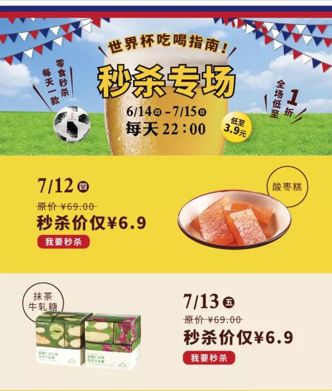 世界杯期间,小铺每晚22:00都会有一折秒杀,现在也进行到最后两场了,还没秒到过的朋友别气馁,抓紧最后的机会!