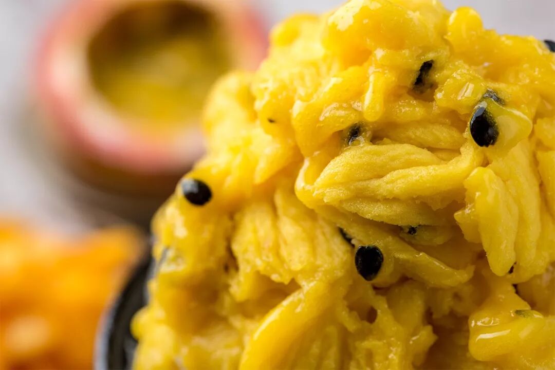 选用印度芒果之王—阿方索芒果和广西的百香果。这款芒果百香果雪泥,除了使用赤藓糖醇代替蔗糖之外,还额外添加了10%的膳食纤维,既降低了热量,又提高了膳食纤维的摄入量,这款产品适合在炎炎夏日解暑开胃,酸甜可口,食用的时候嚼着百香果籽别有一番滋味。