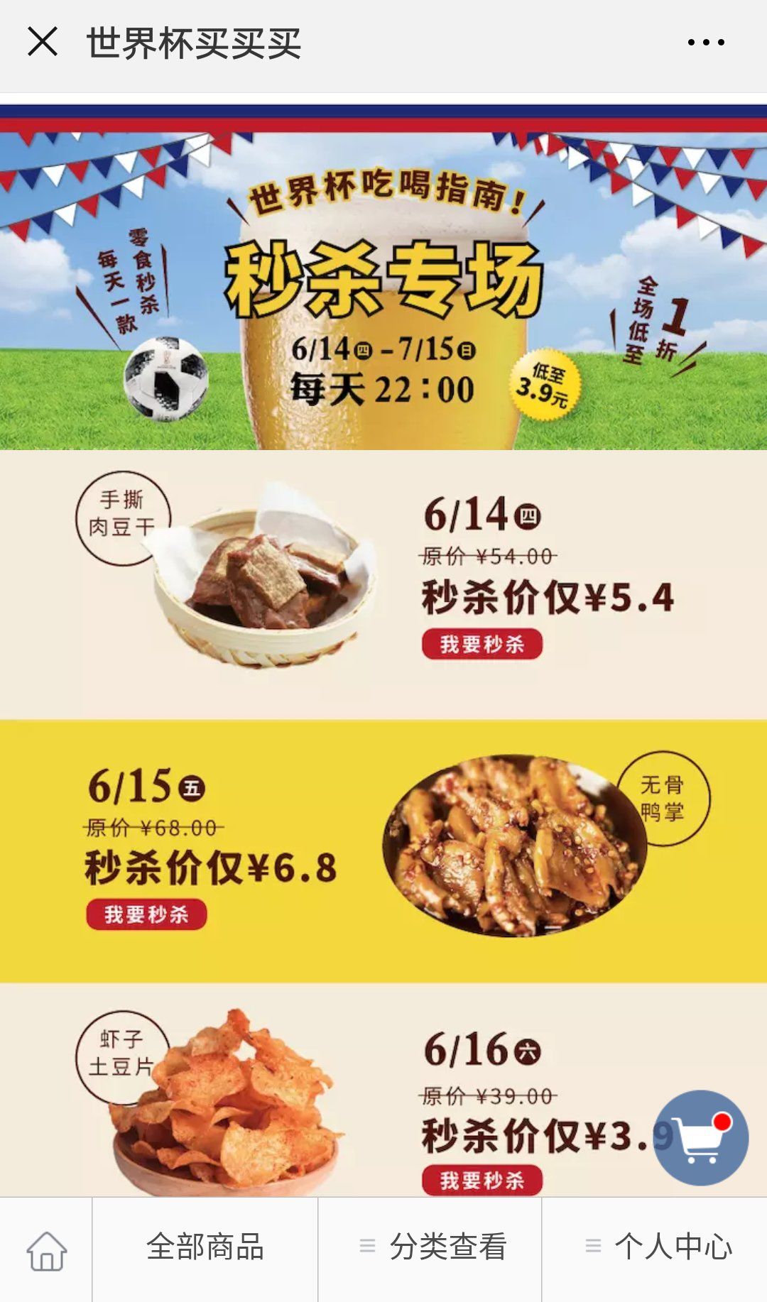 二、点击下方“吃货店铺”菜单栏进入首页,再点击“秒杀专场”的图片进入预约页面