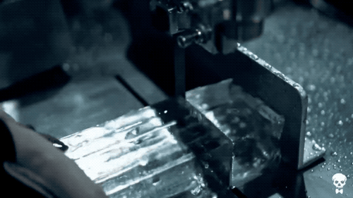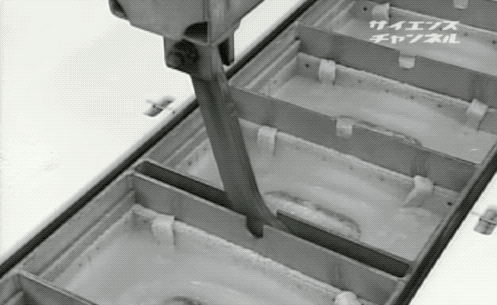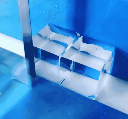 经过 48 小时的完全冻结后,总算到了丰收的时候。这种大批量制冰的工厂,在英文中里也叫 Ice Farm,种水得冰,听起来就好酷。
