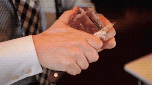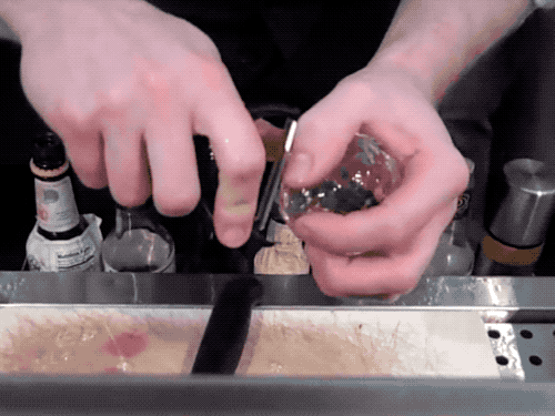 另一位调酒师,玩的就是心跳!制作冰球时是使用冰凿子,先把小方块的四角凿掉。