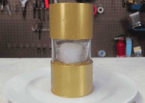 国外还有针对手残党的冰球制作机...材料是铜质的,大夏天放太阳底下晒几分钟,然后把冻好的大冰块夹进去,只用 30s 你的大冰球儿就会融化出来了~下图正在 6 倍速地哗啦啦融化中。