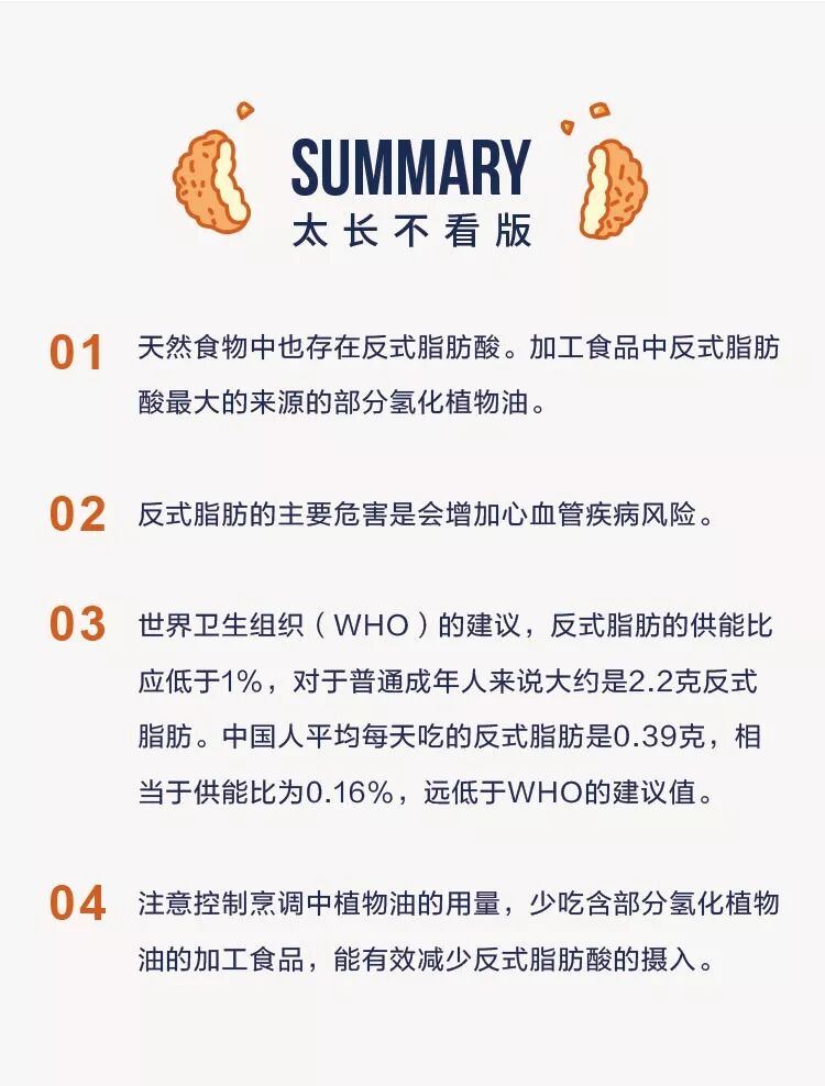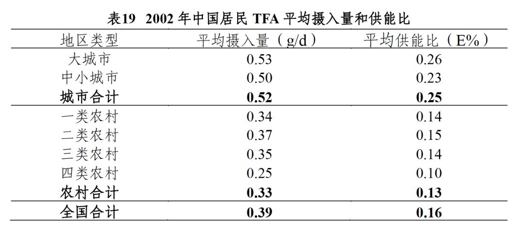 世界卫生组织(WHO)的建议,反式脂肪的供能比应低于1%,对于一个普通成年人来说,大约相当于吃2.2克反式脂肪。调查显示,中国人平均每天吃的反式脂肪是0.39克,相当于供能比为0.16%,城市比农村吃得多一些,平均供能比是0.25%,远低于WHO的建议值。所以,反式脂肪对我们的健康风险其实很低,大家倒也不用太担心。