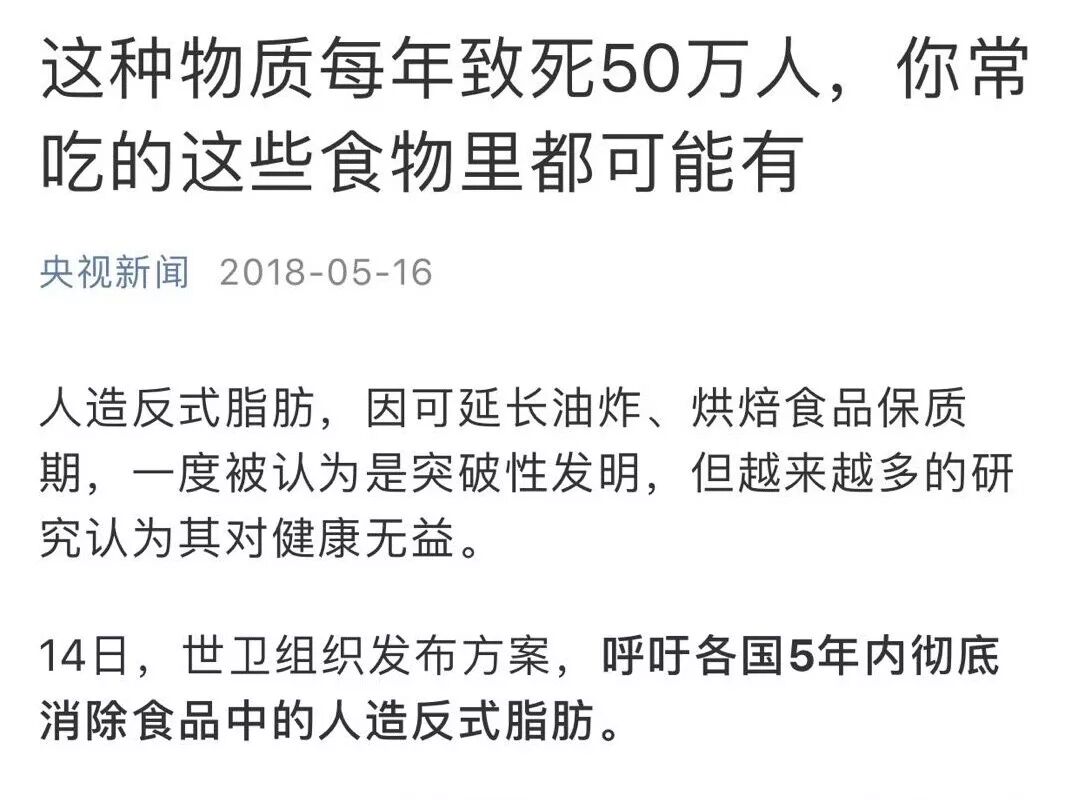 最近,世界卫生组织发布名为“取代”的行动指导方案,计划在2023年之前彻底清除全球食品供应链中使用的工业反式脂肪,主要是部分氢化植物油。大量媒体进行了报道,并引用WHO的数据称反式脂肪每年引起50万人死亡。