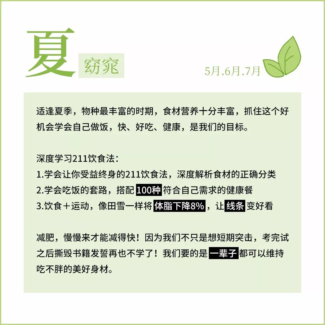 田雪老师设计的所有内容,就是为了通过专业的知识和一年的陪伴,督促你行动起来,帮你养成受益终身的健康生活方式。健康的饮食习惯一旦养成,维持一辈子的好身材就很容易。