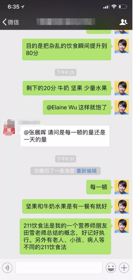 徐小平的健康教练、"得到"精品课《有效管理你的健康》的作者——张展辉,也把211饮食运用在他的减脂营里。