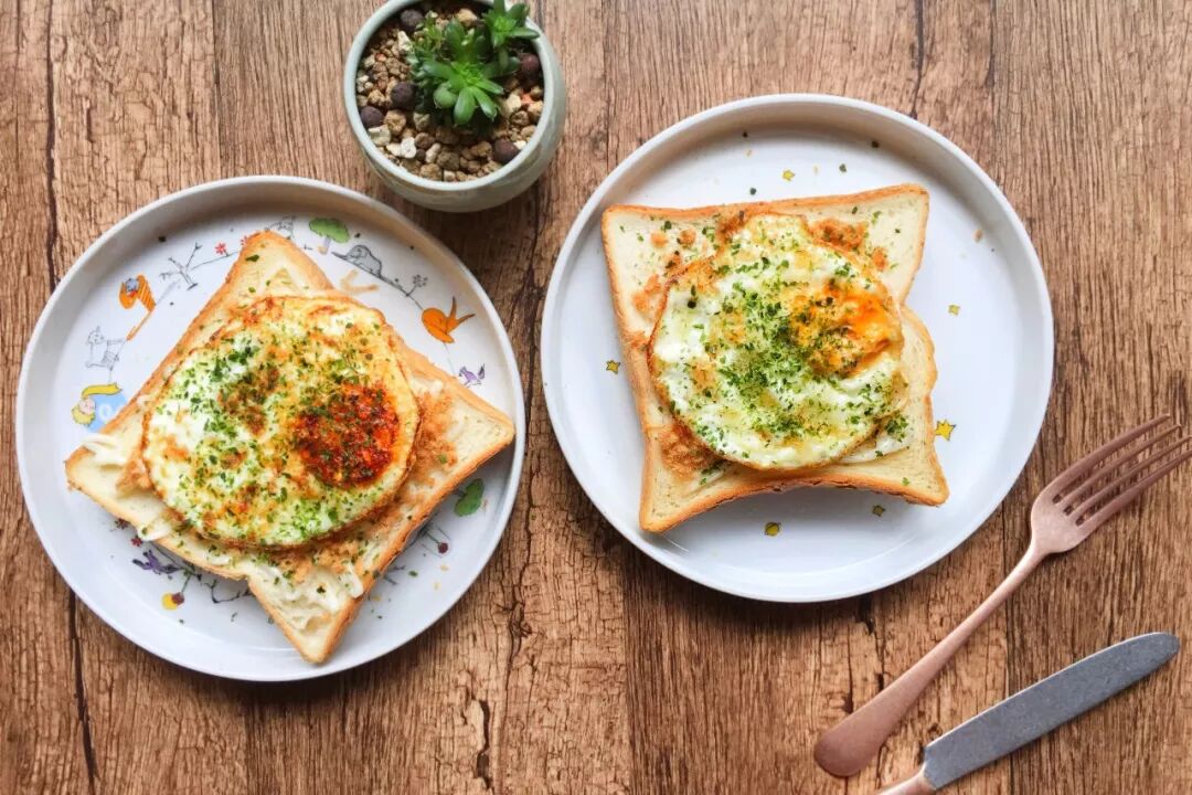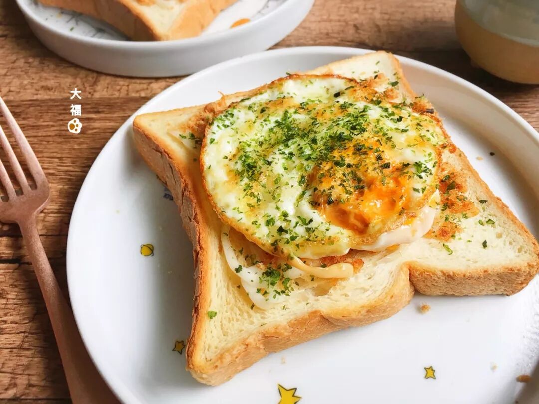 3. 将煎好的鸡蛋摊在刚烤好的厚片吐司上,挤上沙拉酱,洒上海苔粉。