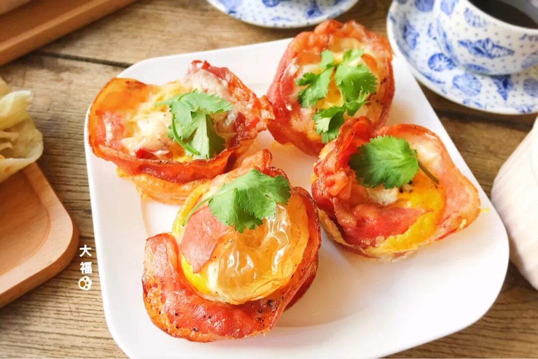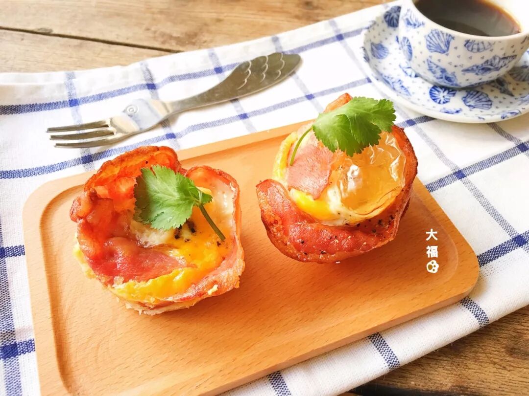培根2条, 鸡蛋2颗, 吐司片2片,香菜(装饰用,请随意)。