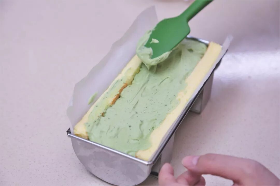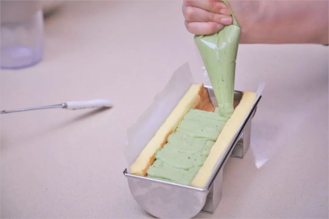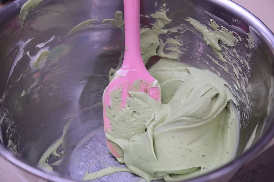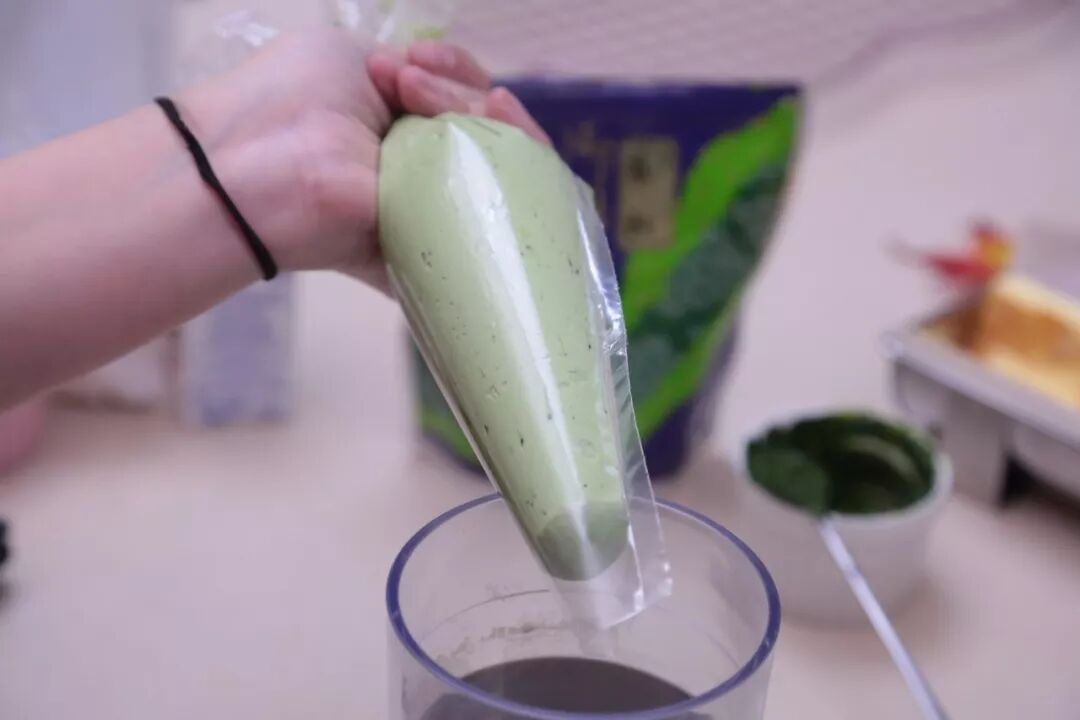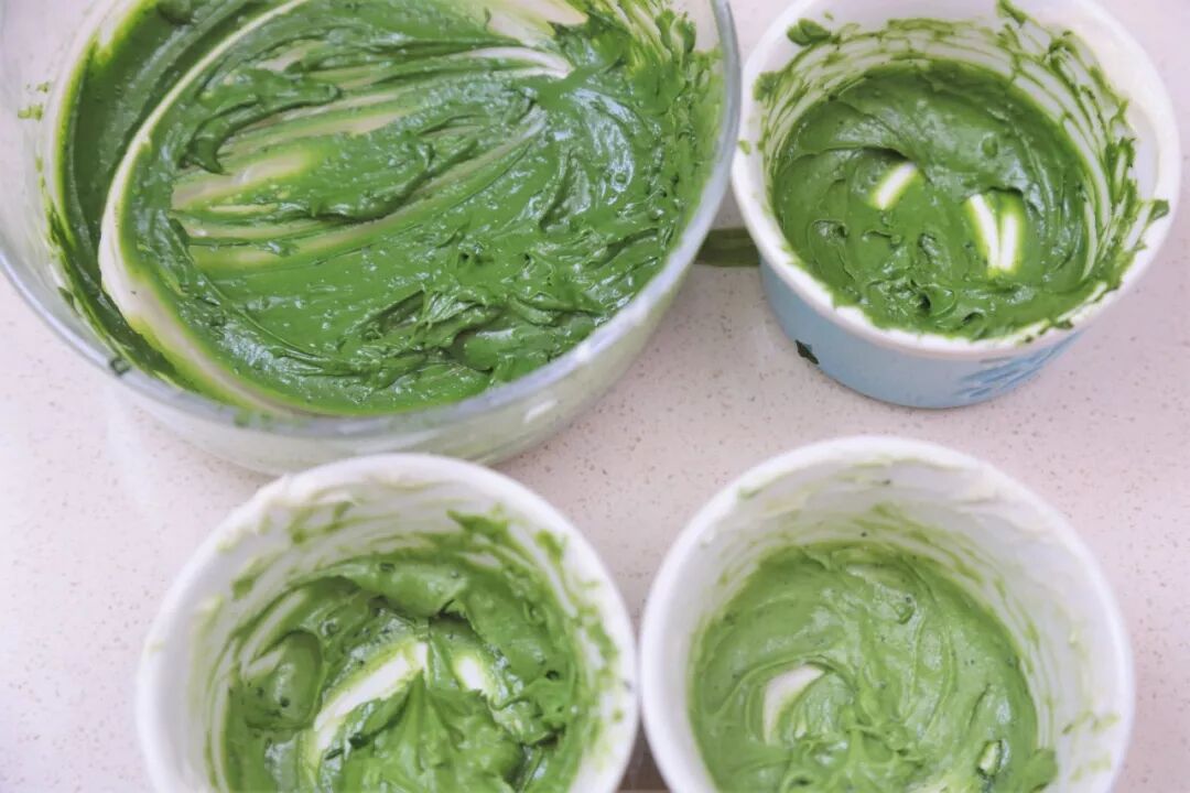 ③黄油霜均分成四份。第一份加2g抹茶酱,第二份加4g,第三份加8g,第四份加16g,全部搅匀后,分别填入裱花袋。