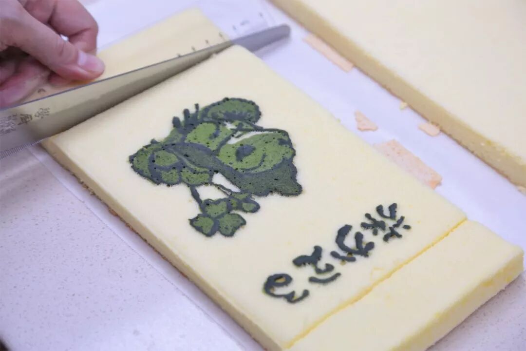 1、用半圆U型模具制作:为了减低精心画好的青蛙儿子在卷起时开裂的概率,我们这次使用半圆U型模具制作。配合模具的造型,需要将蛙儿子画在一侧,另一侧留出一长条蛋糕片用来封口。