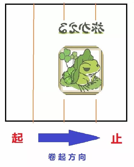 2、用普通蛋糕卷形式制作:如果想使用平时制作蛋糕卷的形式直接卷起,将蛙儿子画在整个烤盘3/4处,依照一般蛋糕卷的制作方式抹上内馅,照着下图指示的方向卷起即可。