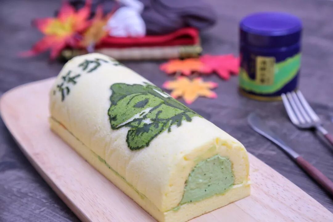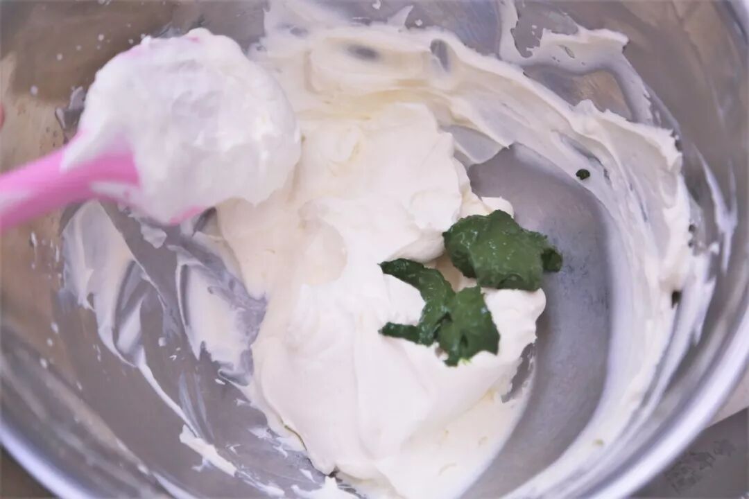 ②抹茶粉加热水用茶筅搅拌成抹茶酱。将抹茶酱加入奶酪奶油霜中搅拌均匀,填入裱花袋备用。