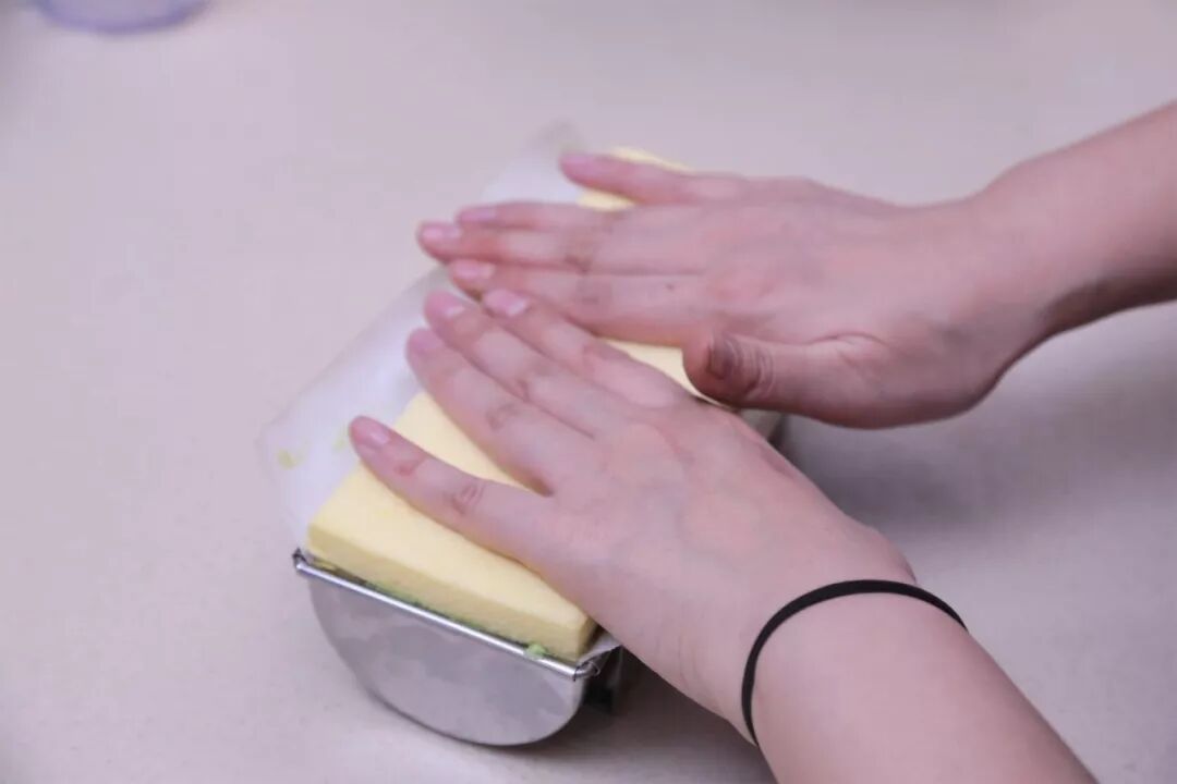 ②将画着蛙儿子的那一面朝下,垫上一层等长裁好的烤纸,放进模具中,紧贴模具表面。