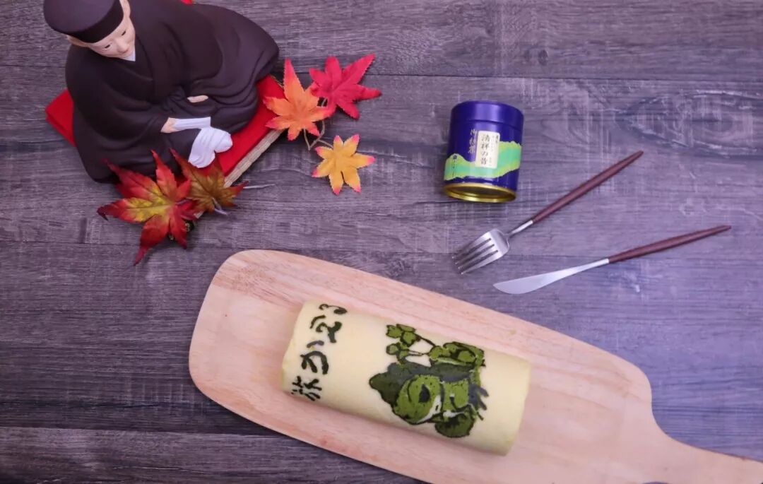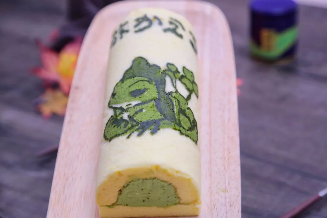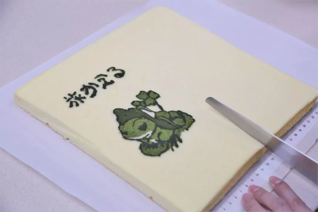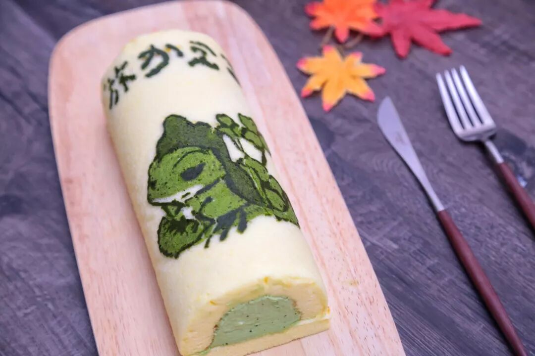 ④将长条蛋糕片盖上,冷藏30分钟(或冷冻10分钟),取出倒置脱模,蛙儿子蛋糕卷就完成啦!