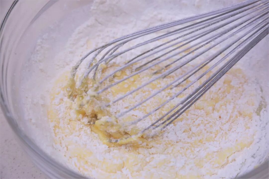 ②黄油软化后,加入糖粉、低筋面粉拌匀,再加入蛋白搅匀。