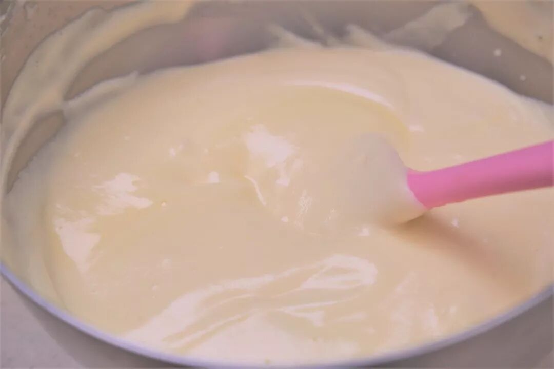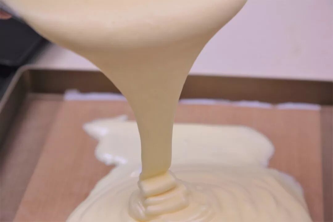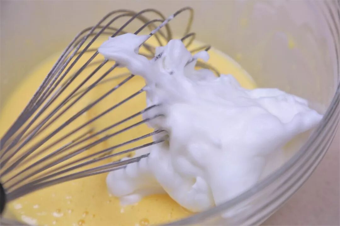 ④取1/3的蛋白霜加入蛋黄搅匀,再将蛋黄糊倒回剩下的蛋白霜中翻拌均匀。